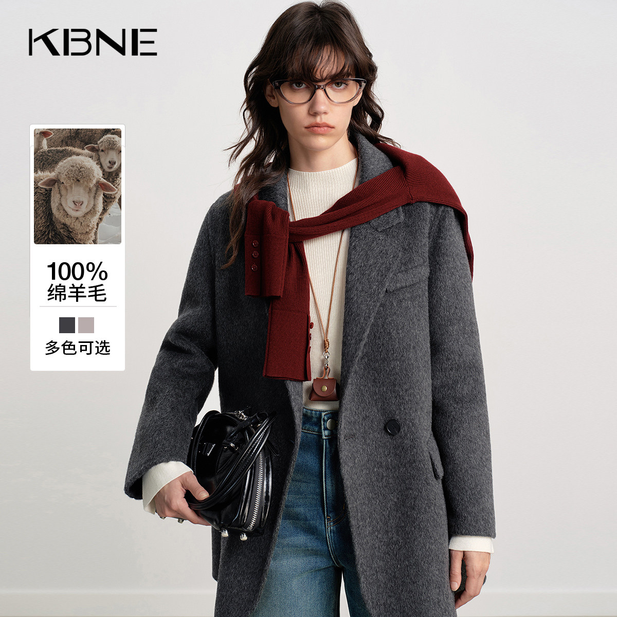 KBNE双色全羊毛毛呢西装外套女2025冬季新款小个子中长款呢子大衣