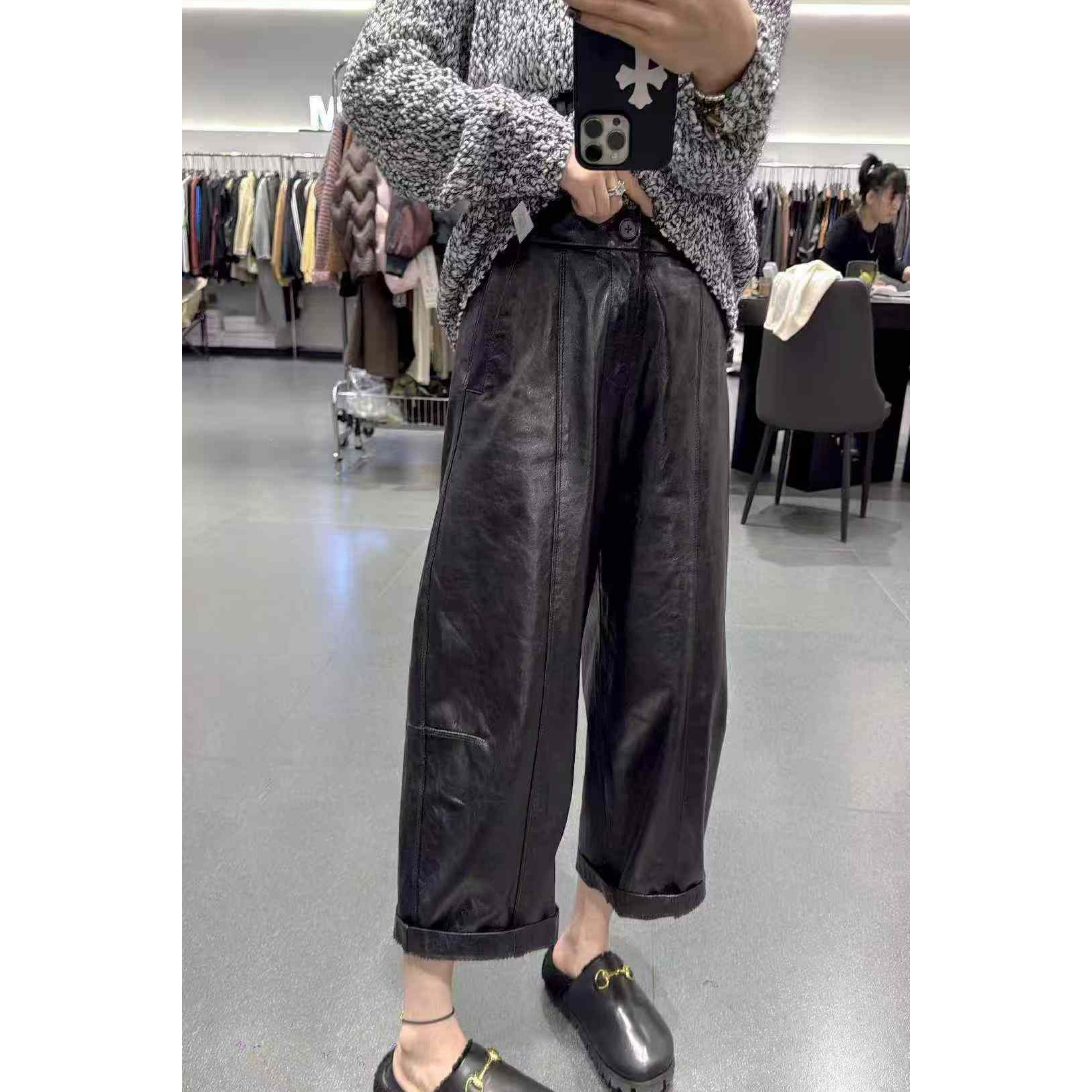 2025秋季新真皮皮裤女绵羊皮九分裤休闲哈伦裤阔腿裤直筒裤潮裤子