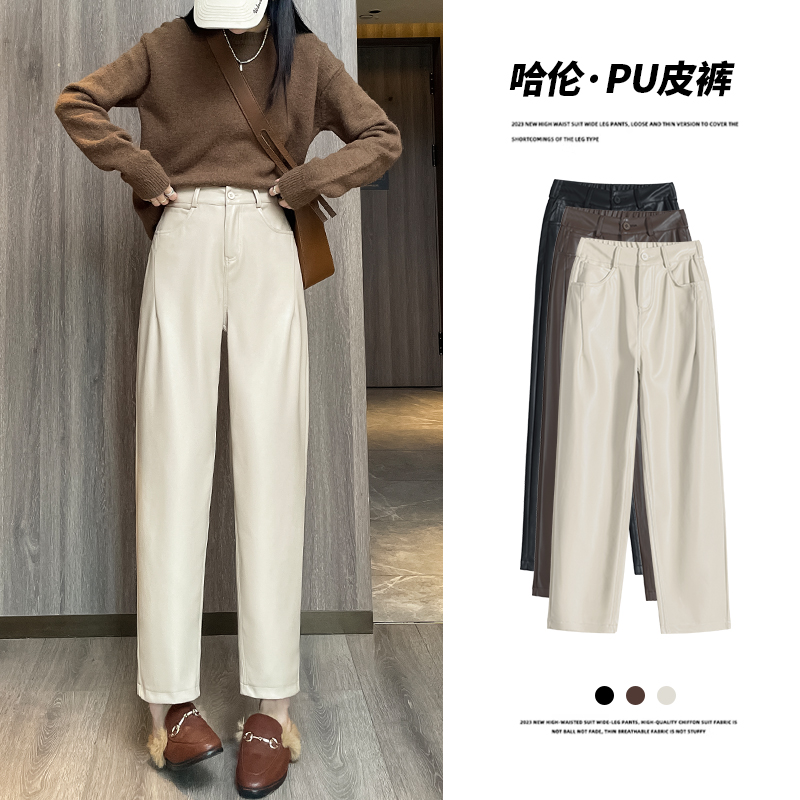 2024水洗休闲皮裤秋冬季宽松高腰显瘦哈伦裤百搭小脚束脚九分裤女