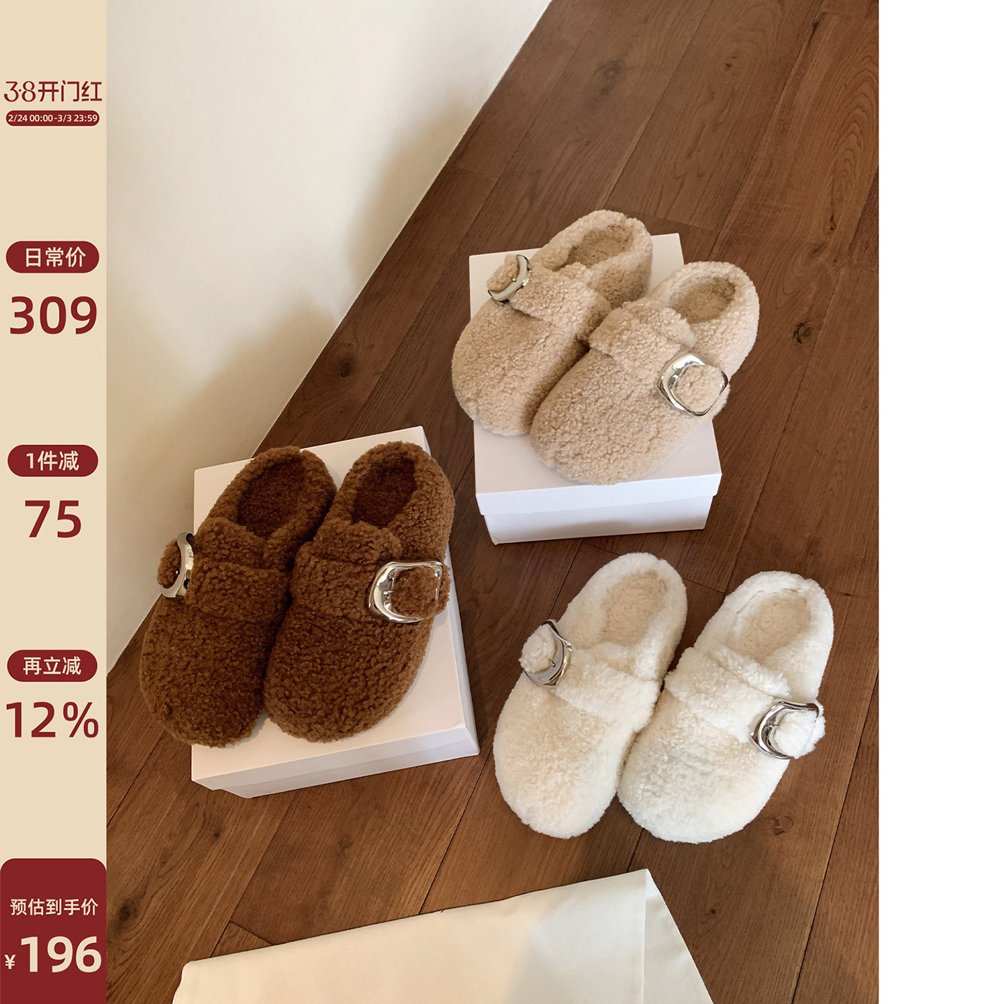 - 羊皮毛一体拖鞋