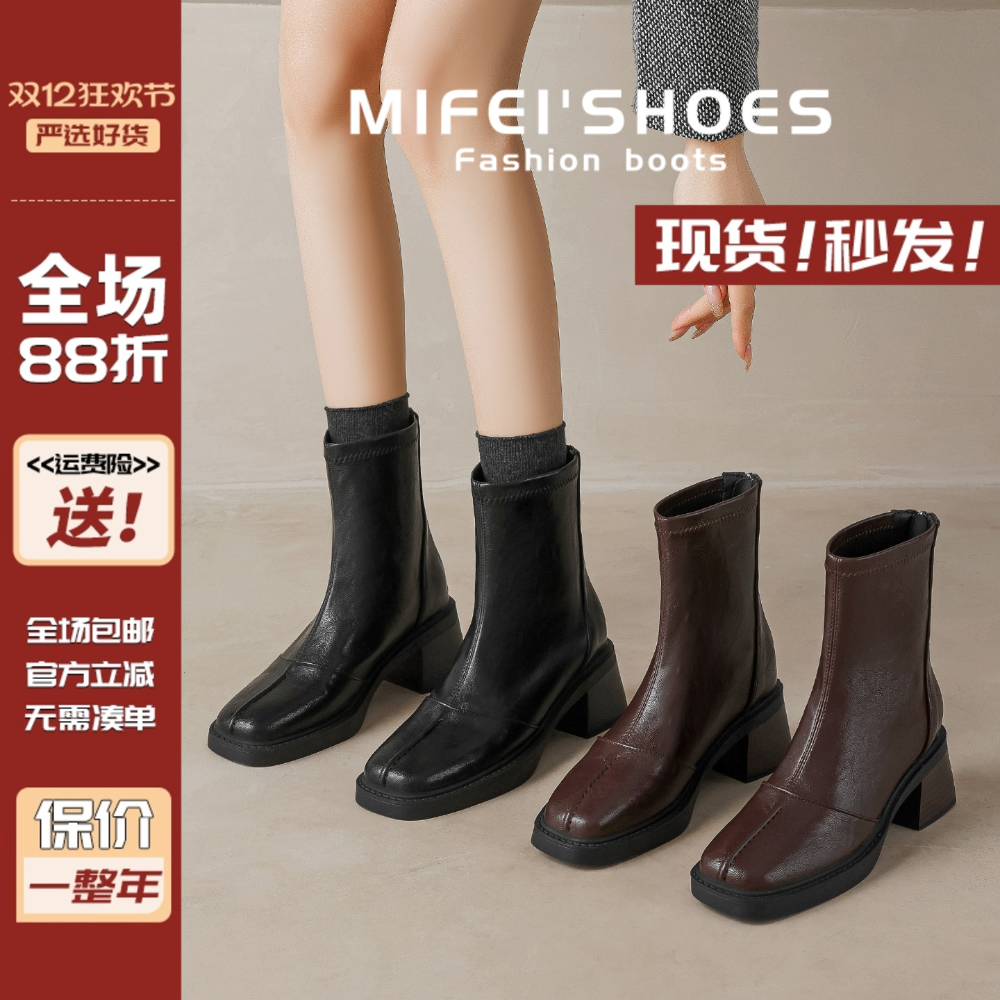 米霏!真皮~棕色方头瘦瘦靴女粗跟马丁靴切尔西高跟短靴大码女靴