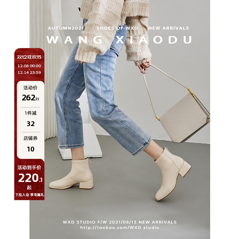【王小毒】Z时代●真皮及裸袜靴短靴女粗高跟新款方头加绒瘦瘦靴