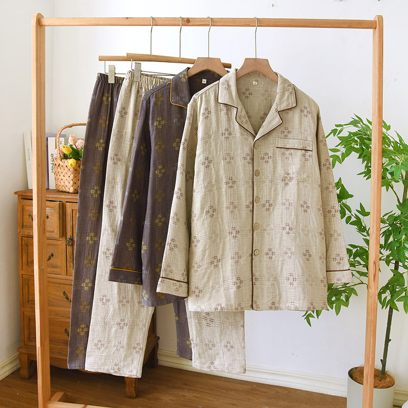 复古提花纯棉纱布男士睡衣春秋新款高档全棉薄款日系宽松家居服套