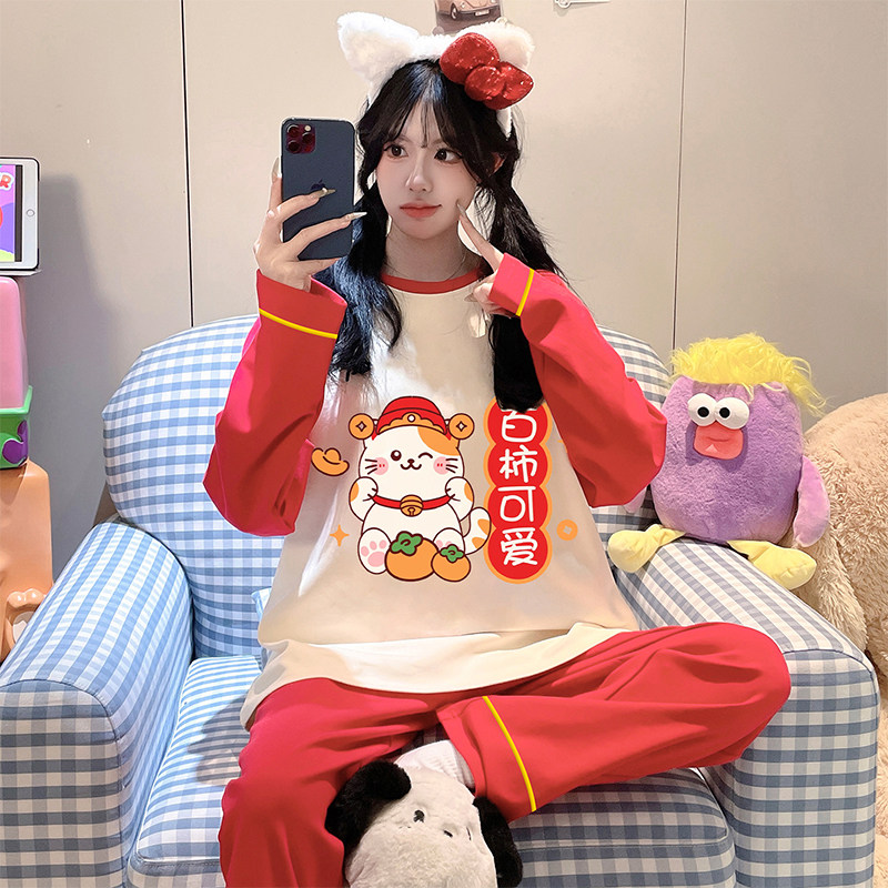 女士睡衣春秋款长袖长裤纯棉套装女款红色内衣本命年招财猫家居服