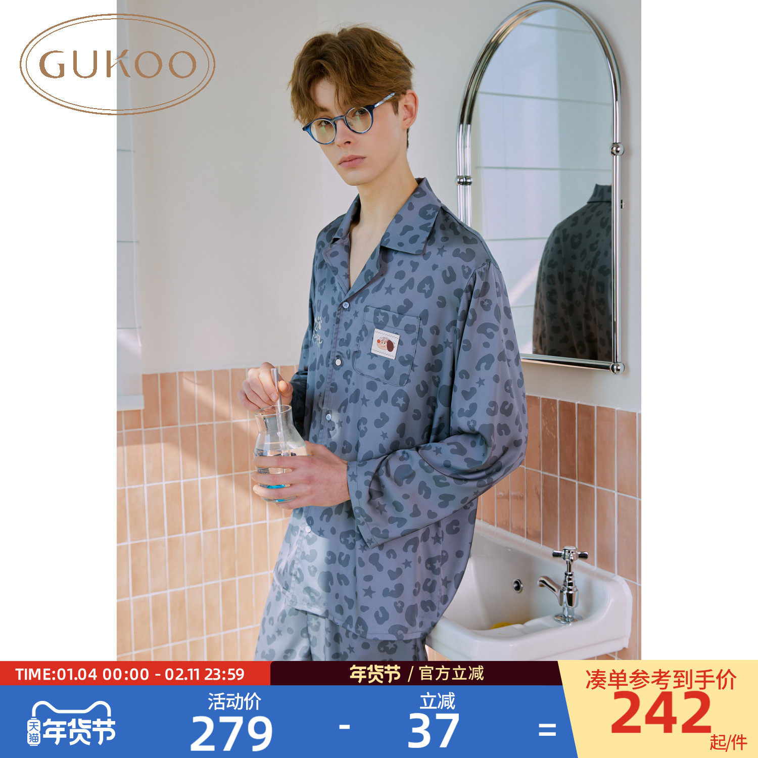 Gukoo果壳男士长袖睡衣春秋新款轰轰小狗印花豹纹男士家居服套装A