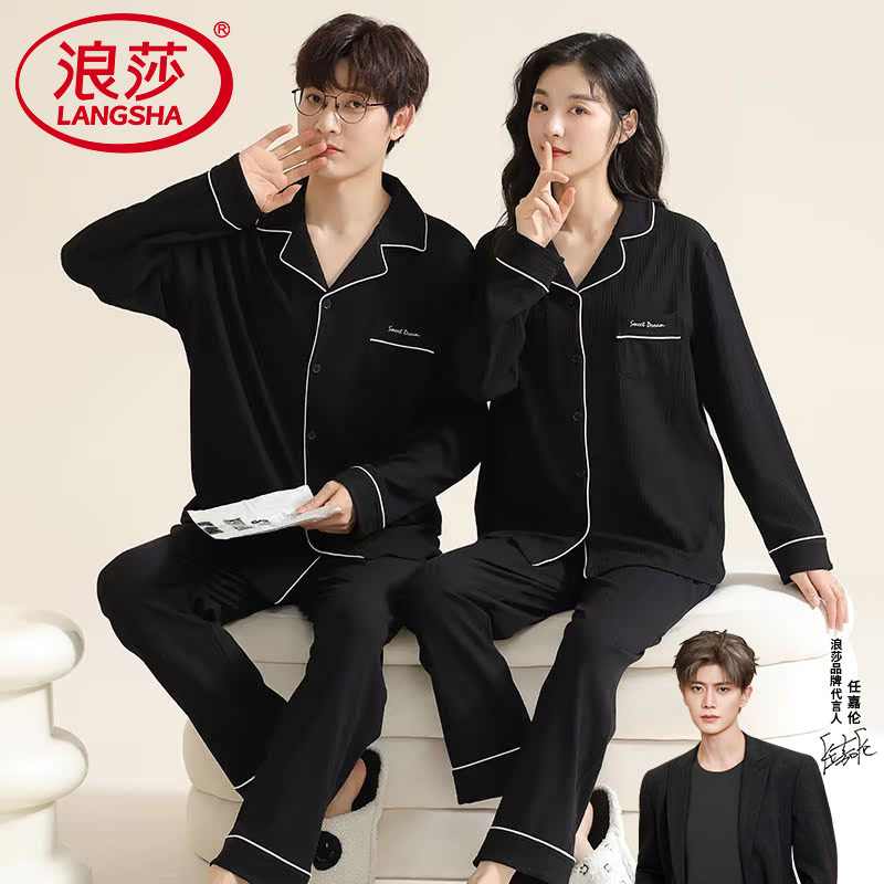 浪莎情侣睡衣春秋纯棉翻领开衫长袖男女士套装全棉黑色家居服套装