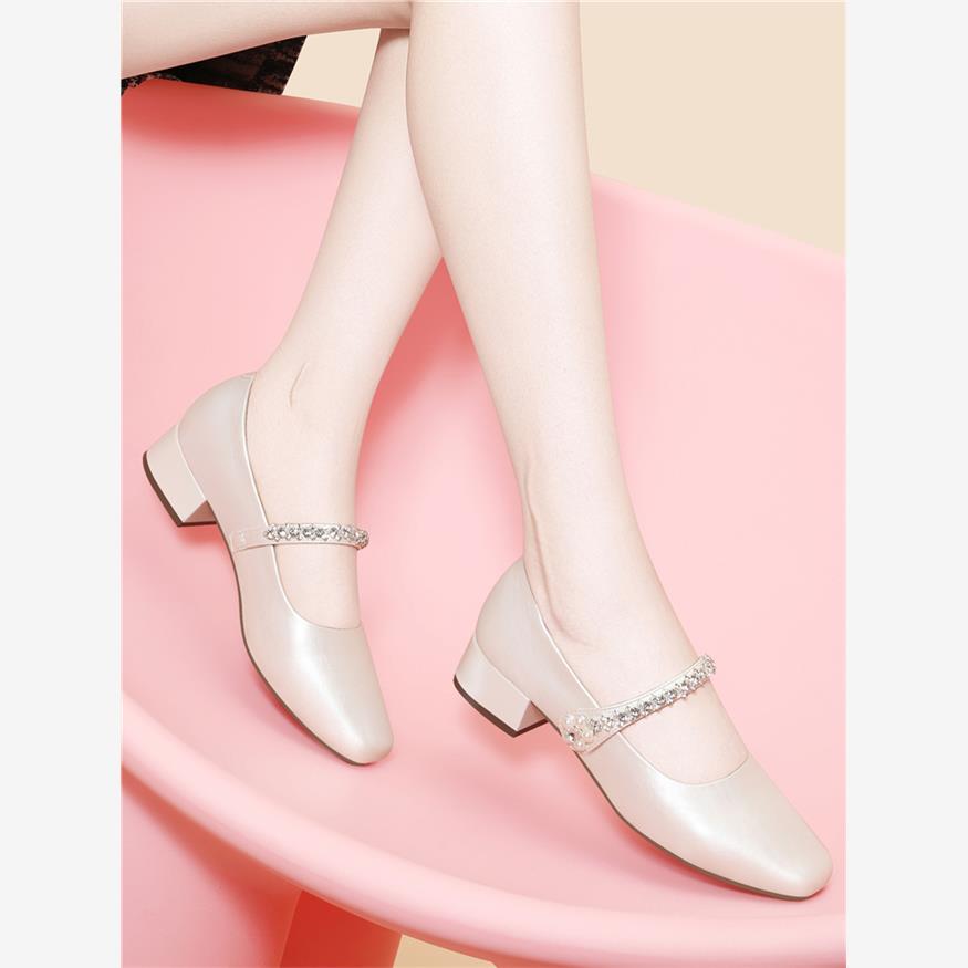 大东浅口方头单鞋女2025新款秋季粗跟珍珠女鞋法式配裙子玛丽珍鞋
