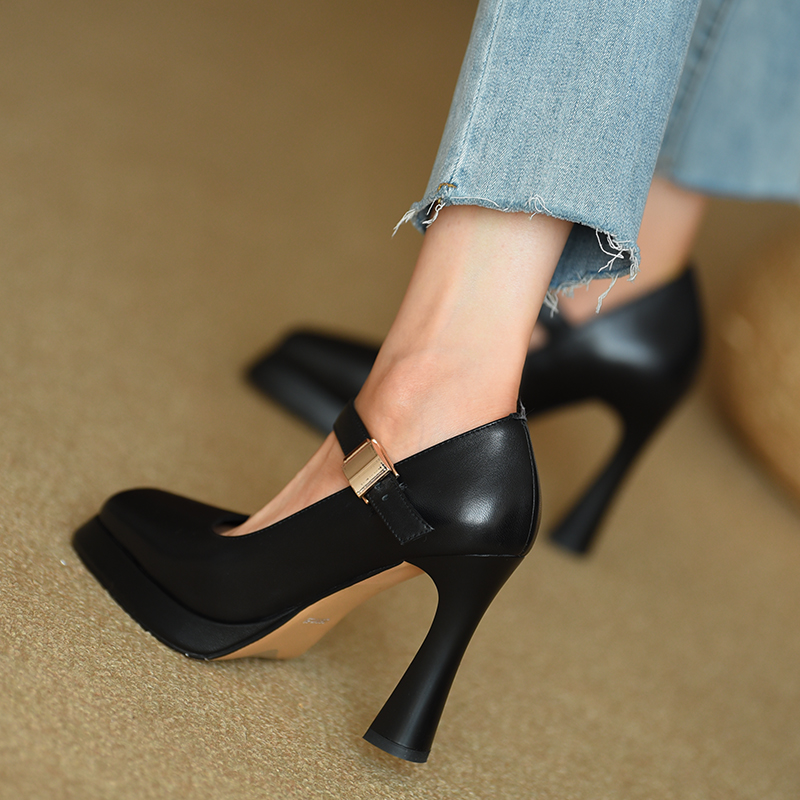 [博主推荐]康莉春季新款高跟单鞋女方头真皮通勤时尚方扣浅口鞋子