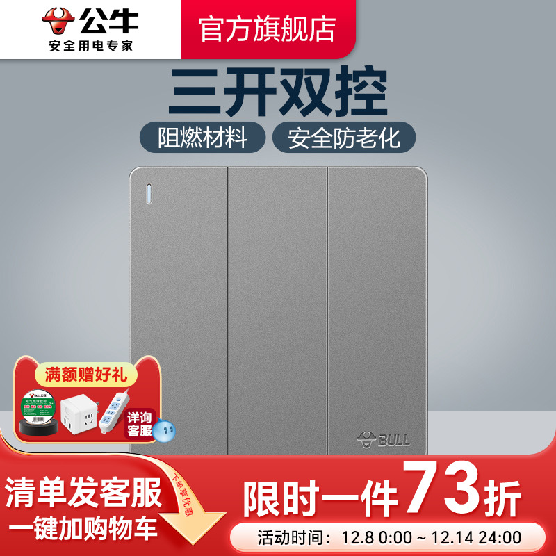 公牛三开双控三联三位双控多联墙壁开关插座面板家用暗装G12灰