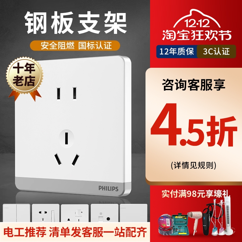 飞利浦钢架支撑开关插座家用墙壁五孔16空调插座暗装面板明暗装插