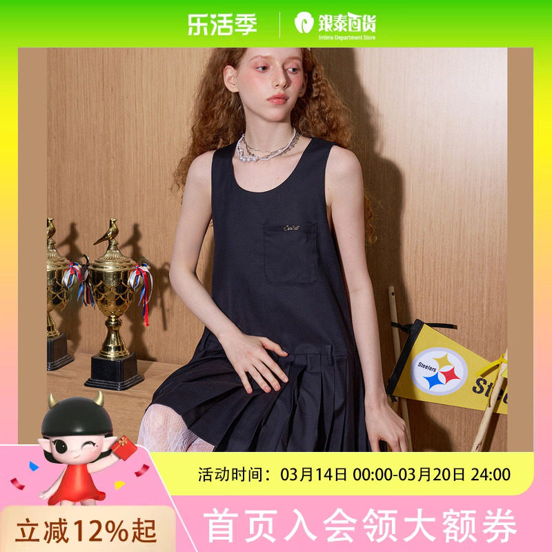 coolhut学院风百褶背带背心气质口袋刺绣无袖A字拼接2025夏连衣裙