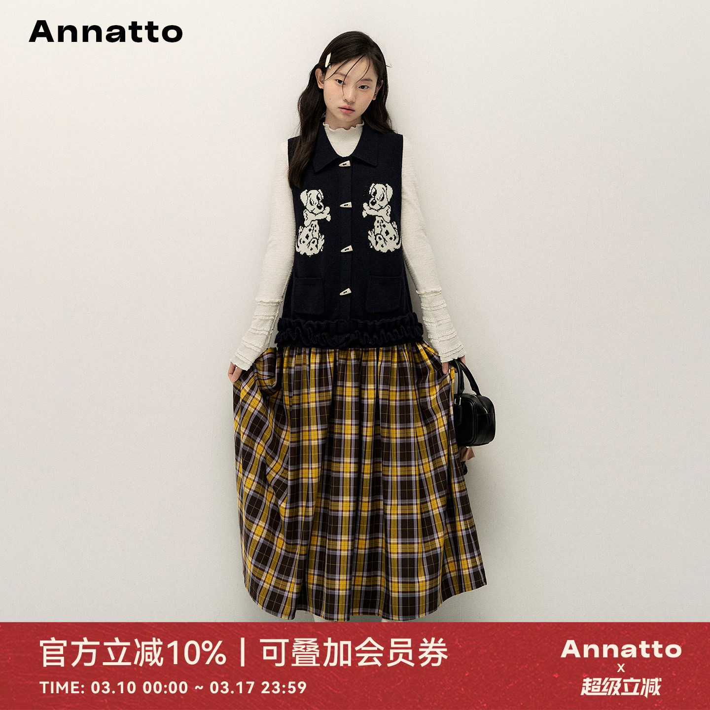 ANNATTO 小狗提花 冬季藏青无袖毛衣学院风假两件拼接格纹连衣裙