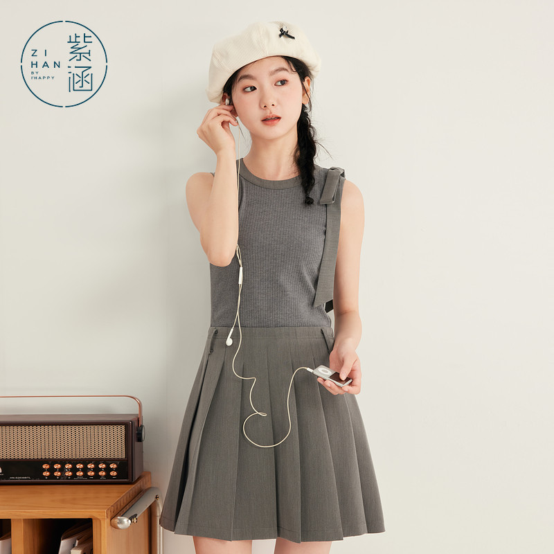 紫涵灰色圆领背心拼接连衣裙女夏季新款学院风假两件无袖百褶短裙