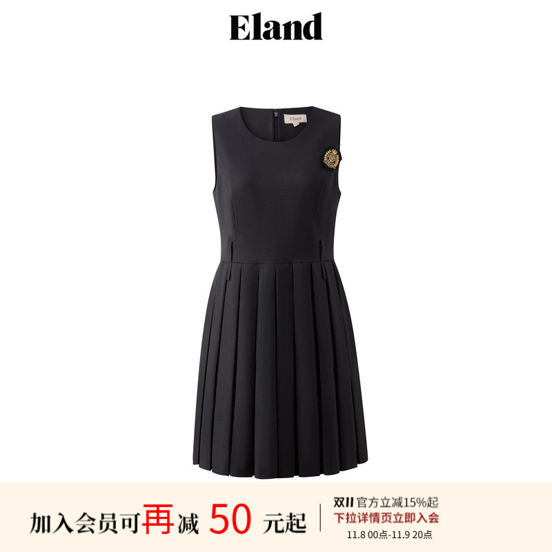 【Eland奥莱】衣恋连衣裙女中长款学院风方领无袖过膝裙子女秋冬