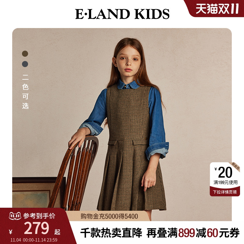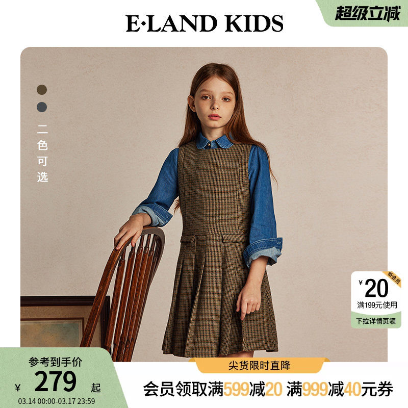 eland kids衣恋童装女童连衣裙春秋英伦学院风简约无袖百褶裙子