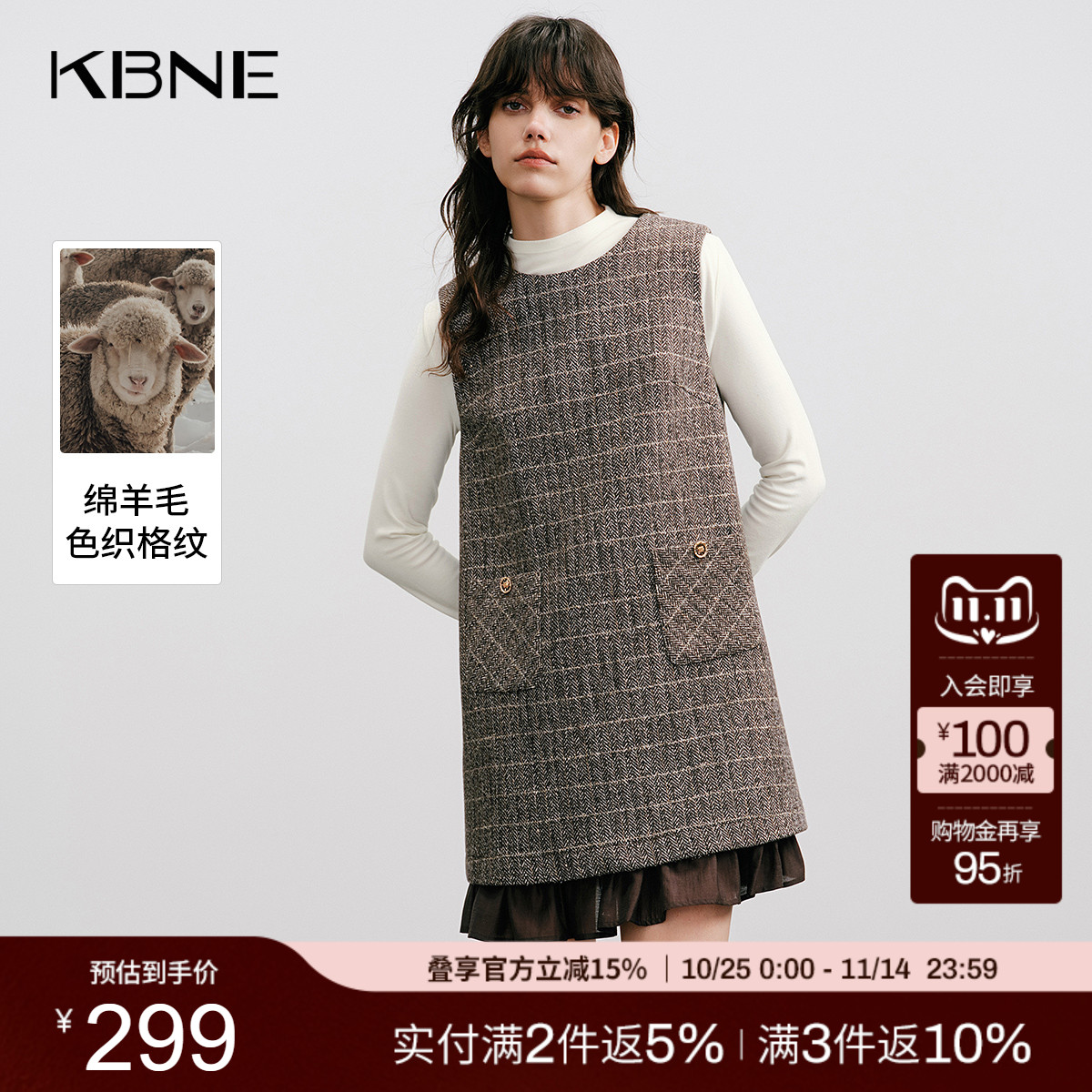 KBNE法式学院风绵羊毛无袖连衣裙女2025秋季新款复古气质背心裙子