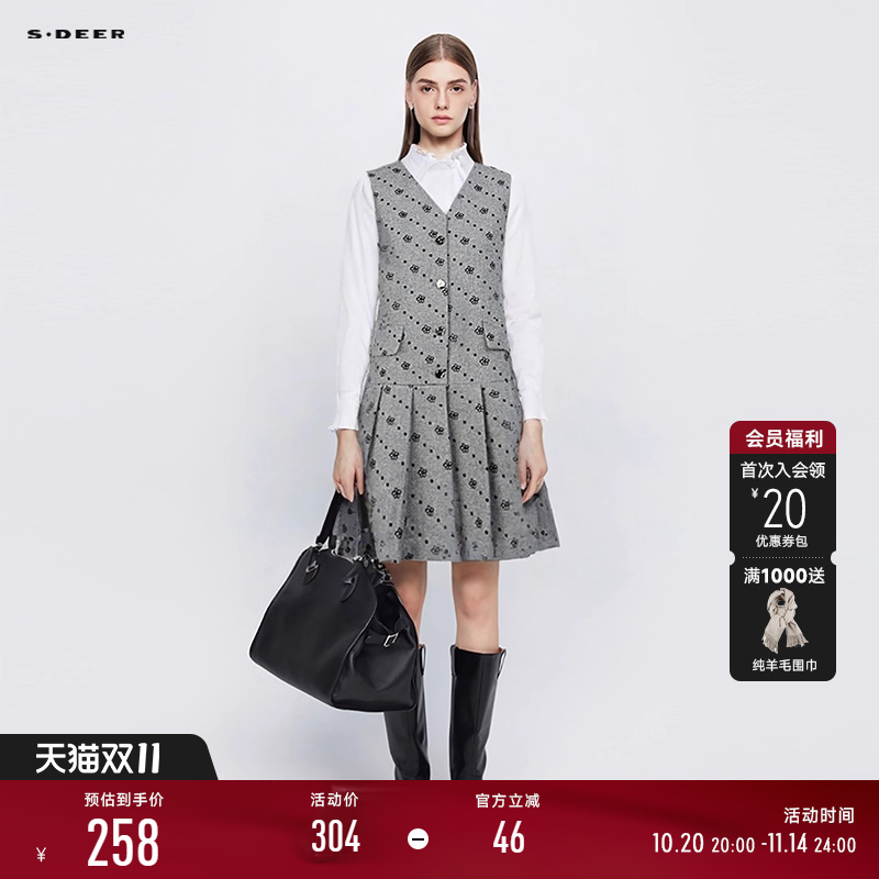 sdeer圣迪奥冬季女装学院风V领印花毛呢无袖连衣裙S244Z1289