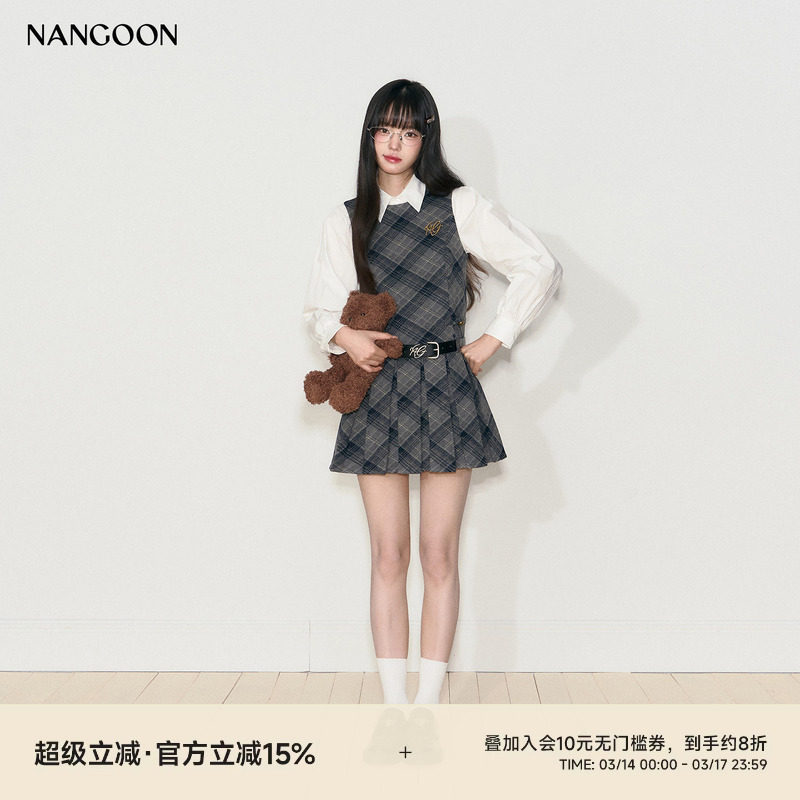 NANGOON 长袖衬衫上衣无袖百褶连衣裙套装气质学院风裙子百搭上衣