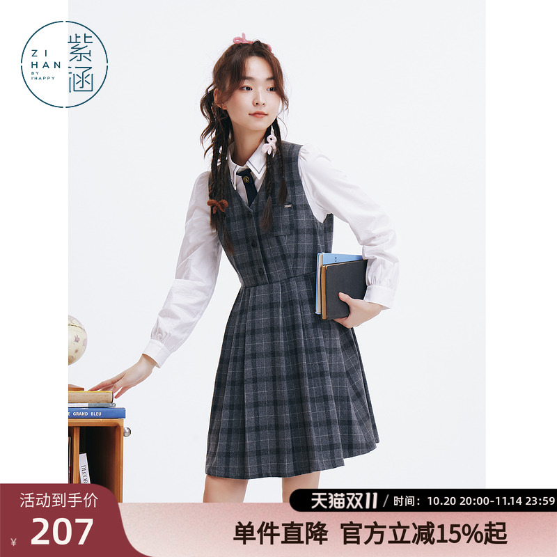 紫涵背心百褶连衣裙女春秋季新款甜美学院风小个子无袖高腰短裙子