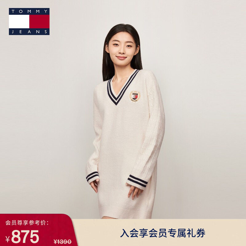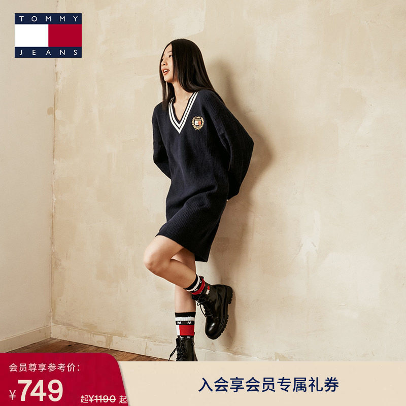 【撞色V领】Tommy秋冬女美式学院风复古休闲刺绣肌理针织衫连衣裙
