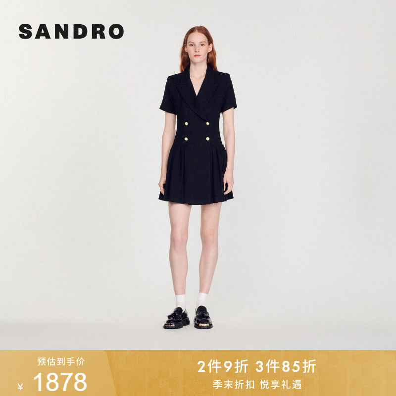 SANDRO秋冬女装法式气质时尚学院风黑色收腰双排扣短款花呢连衣裙