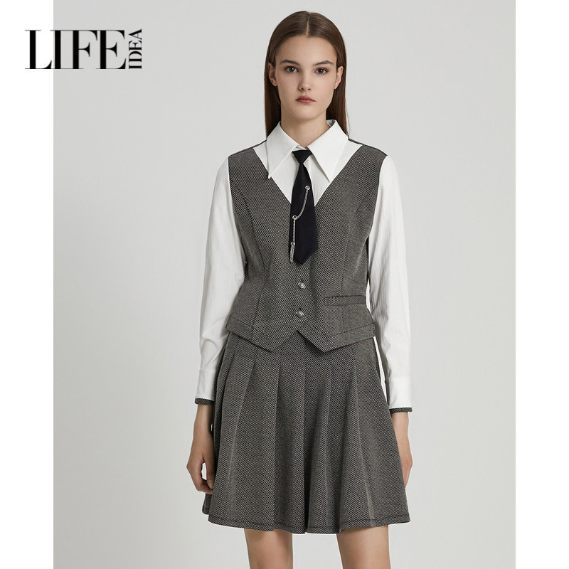 莱芙艾迪儿时髦复古学院风假两件连衣裙女秋冬减龄经典百搭连衣裙