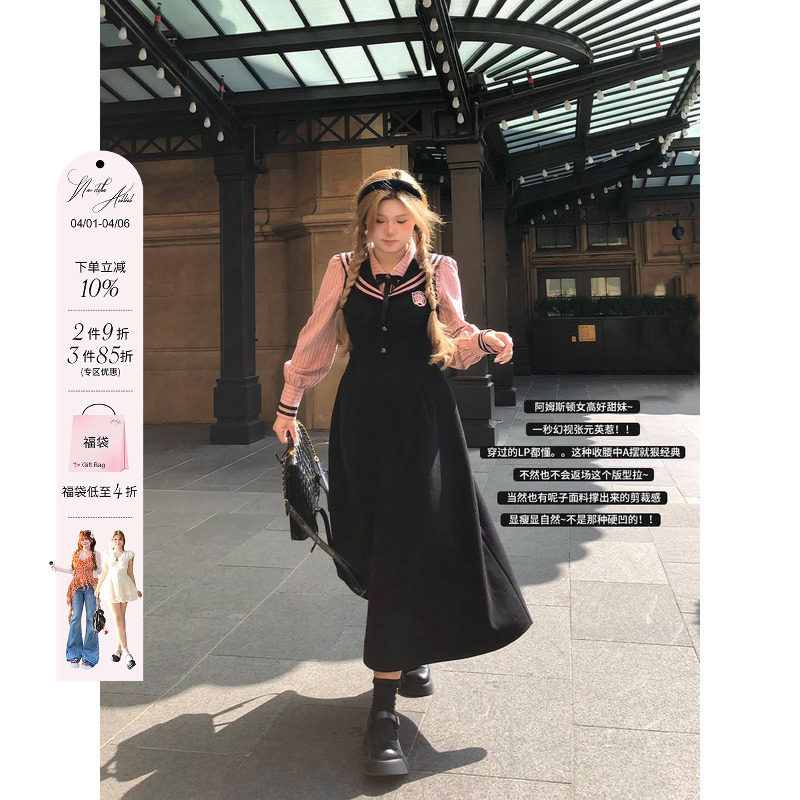 织物猪 东城学姐 学院风假两件连衣裙女秋冬新款黑色外套拼接短裙