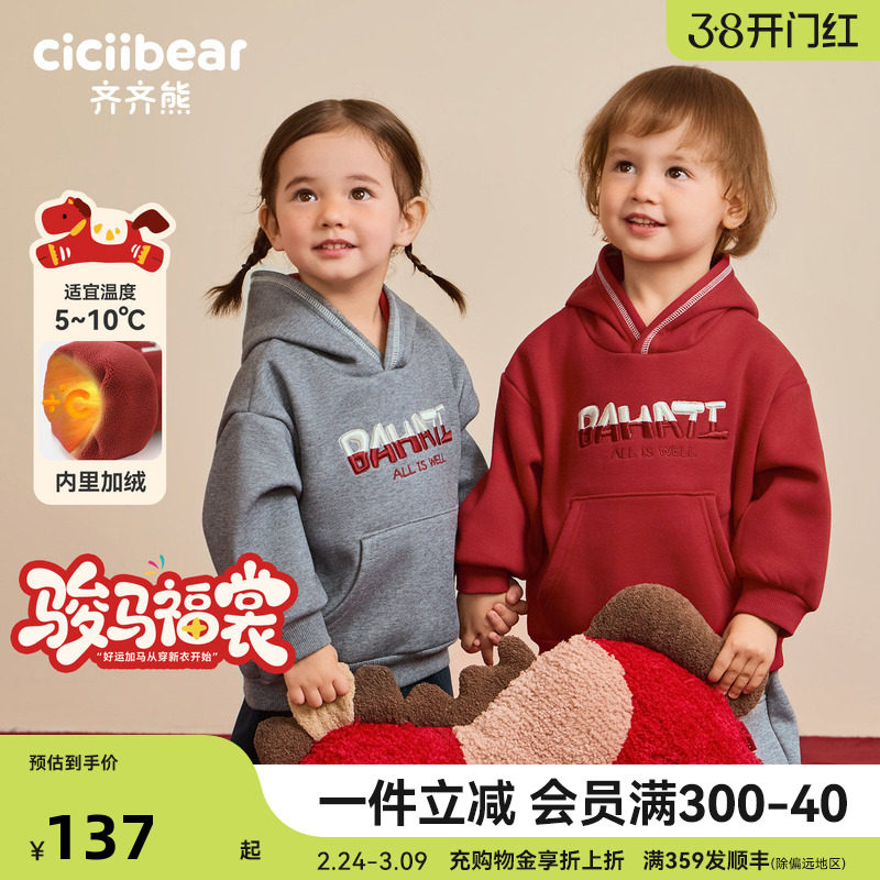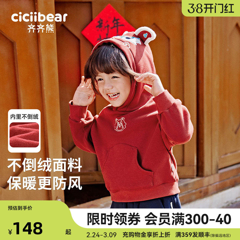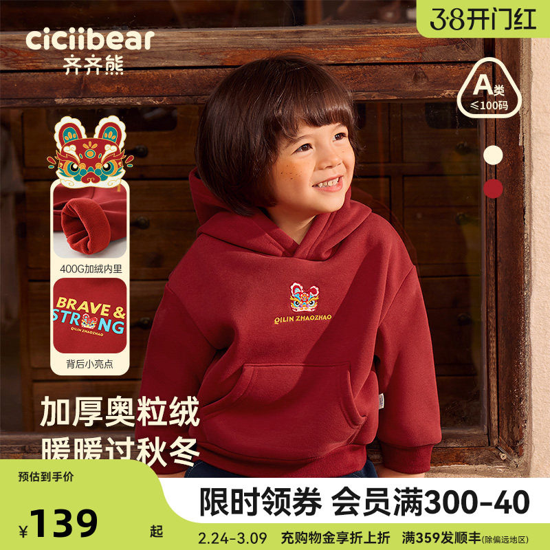 [一体绒]齐齐熊宝宝加绒卫衣男童红色连帽拜年服儿童新年加绒上衣