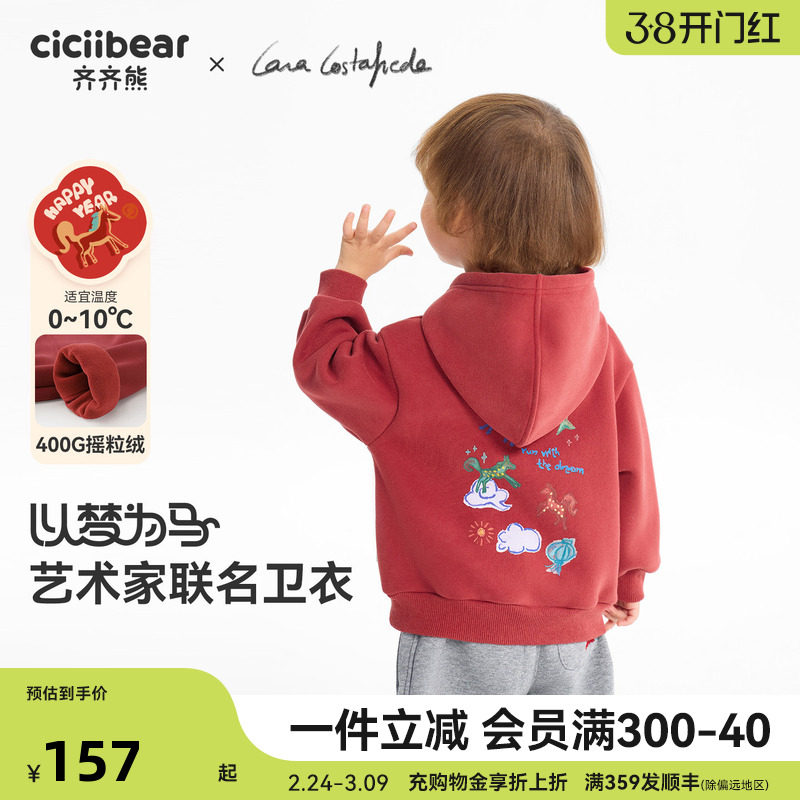 [大师联名400G摇粒绒]齐齐熊宝宝加绒卫衣男女童冬款连帽儿童红色