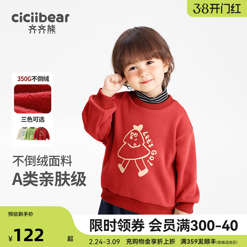 [300g摇粒绒]齐齐熊宝宝加绒卫衣男童冬款红色上衣儿童新年拜年服