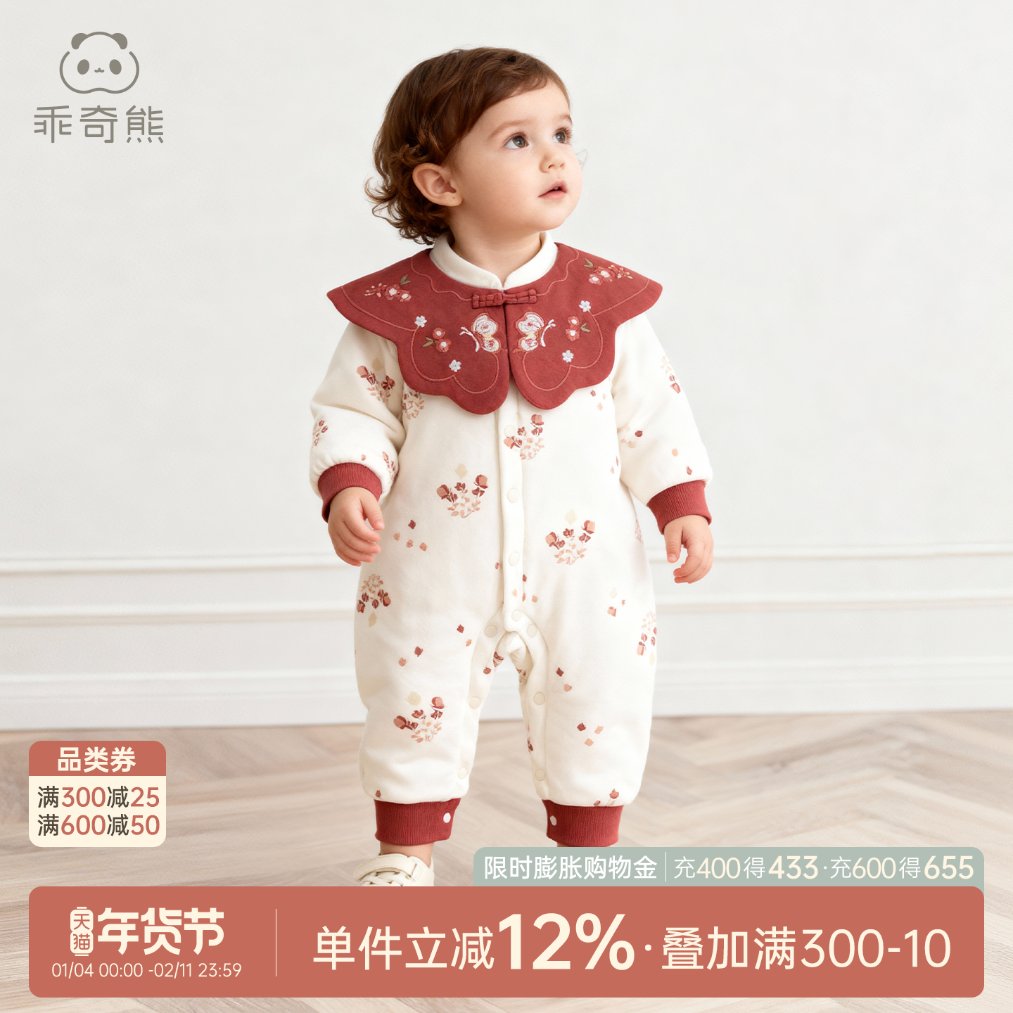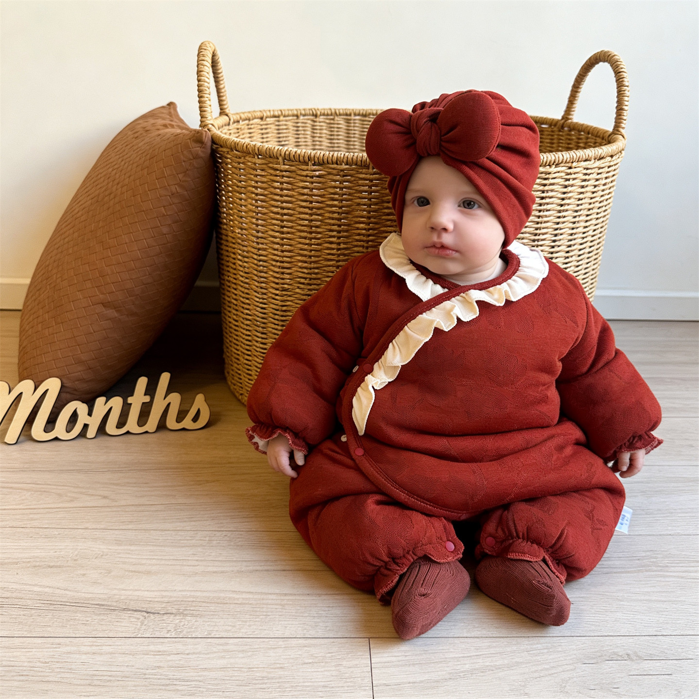 【暖护棉】女宝宝夹棉连体哈衣加厚保暖婴儿红色中式过年爬服冬季