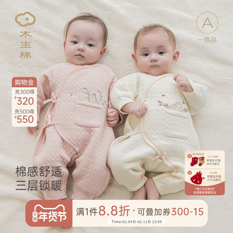 木生棉女宝宝连体衣秋冬季新生婴儿夹丝保暖和尚服可爱哈衣爬爬服