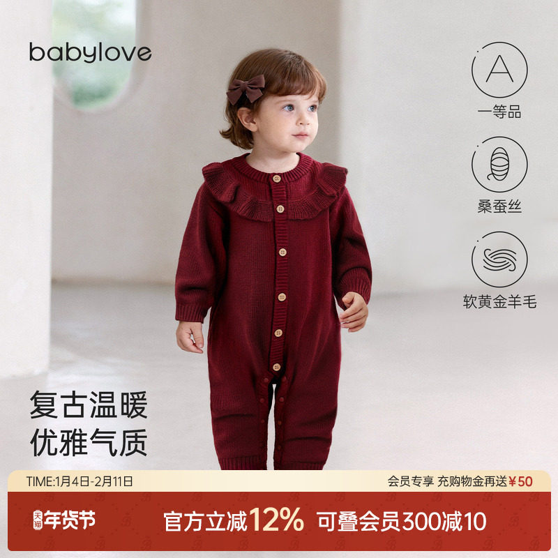 babylove女宝宝连体衣秋冬季羊毛针织保暖哈衣爬服新年红色衣服