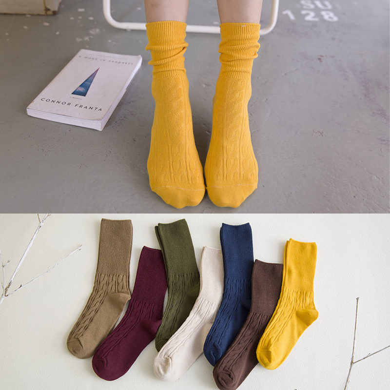 秋冬撞色麻花立体浮雕女士棉质中筒袜韩国ins复古森系透气堆堆袜