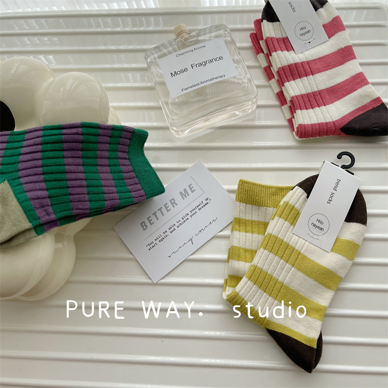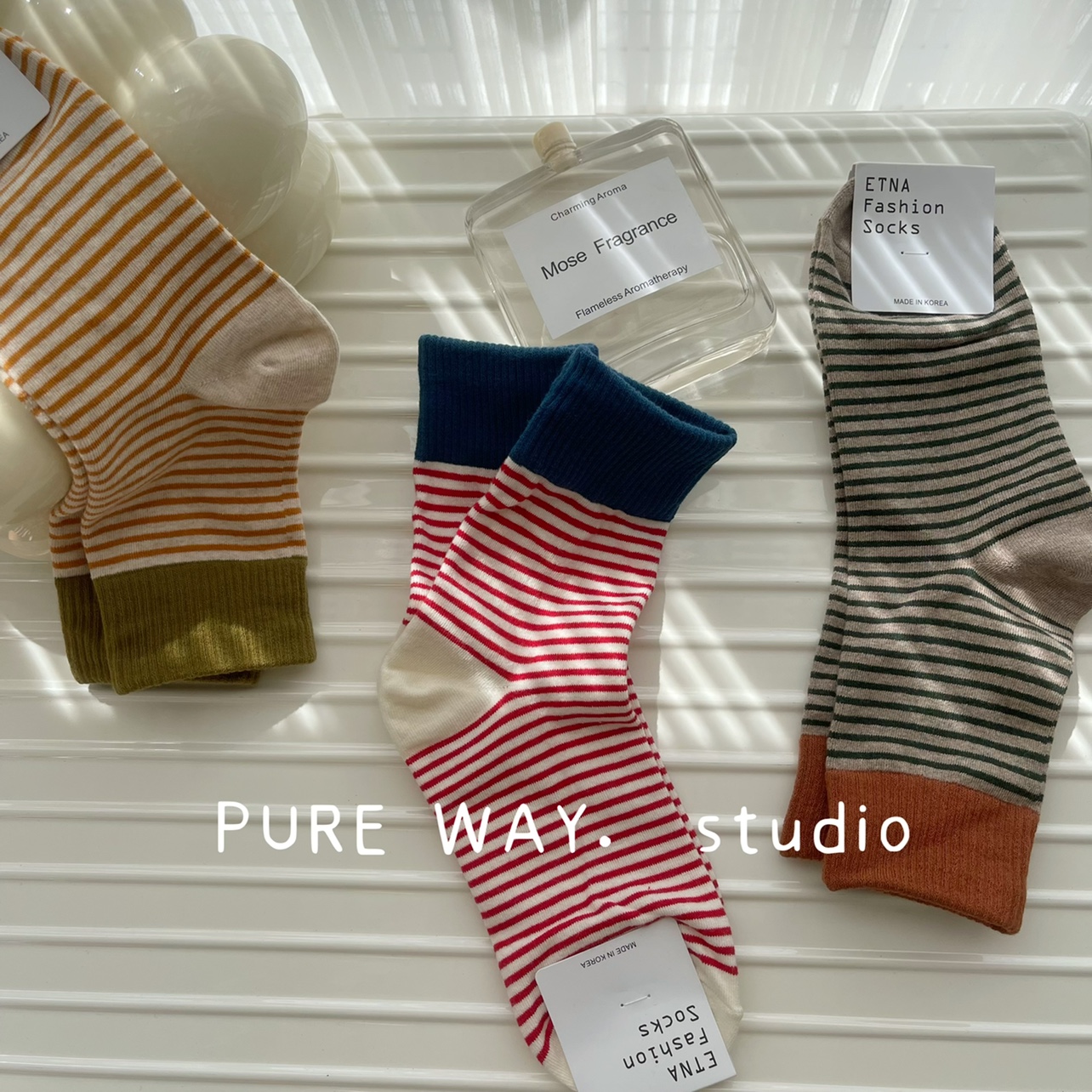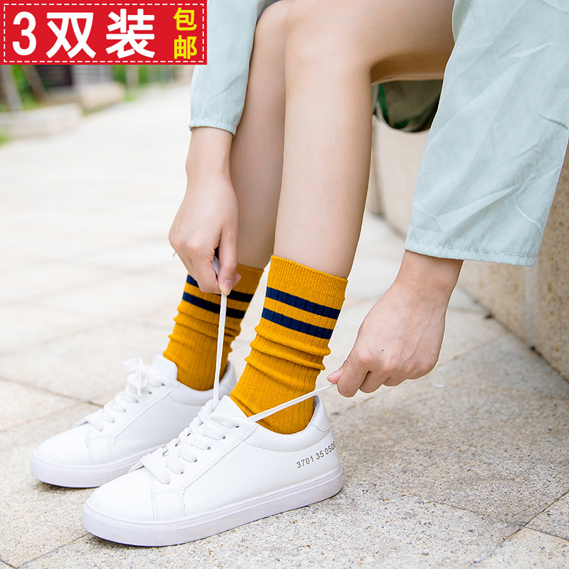秋冬多巴胺撞色条纹双针韩国东大门复古中筒袜女士精梳纯棉堆堆袜