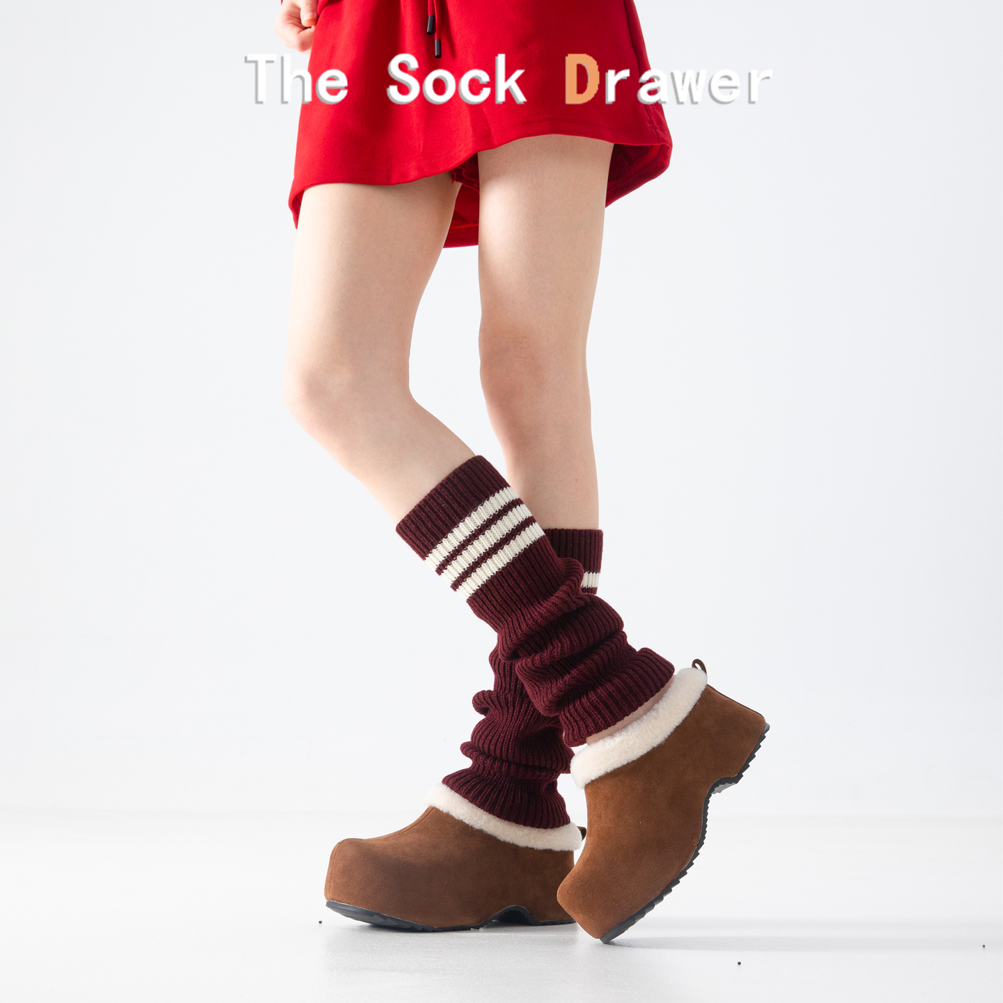 韩国东大门秋冬保暖加厚袜套女士横机暗红条纹及膝长筒堆堆袜腿套