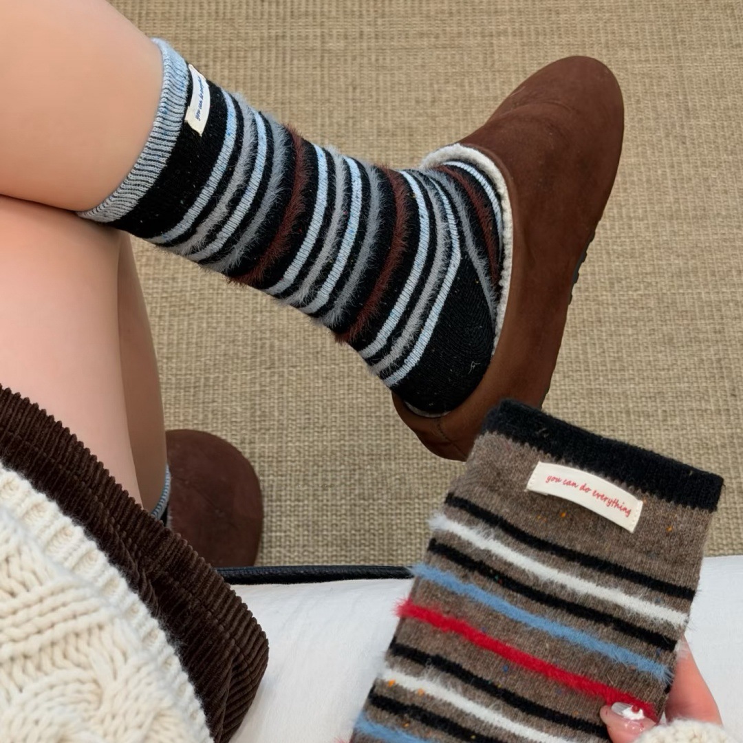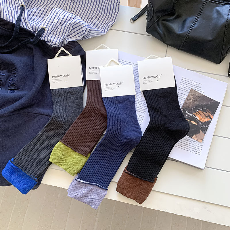 韩国进口秋冬精梳棉高罗口撞色条纹中筒袜女士堆堆袜百搭ins复古