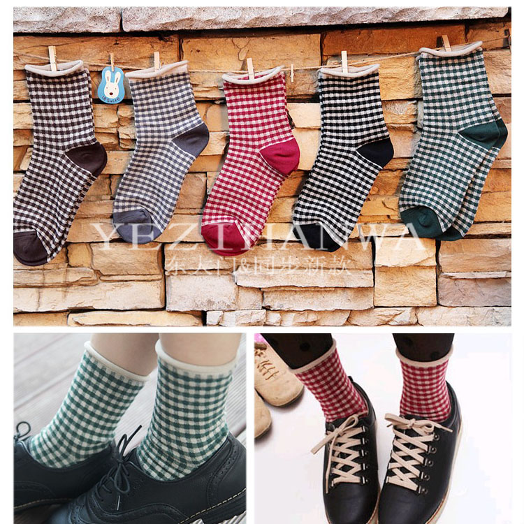 韩国袜子女士中筒英伦格子纯棉袜女袜 秋冬女士短袜卷边堆堆袜 潮
