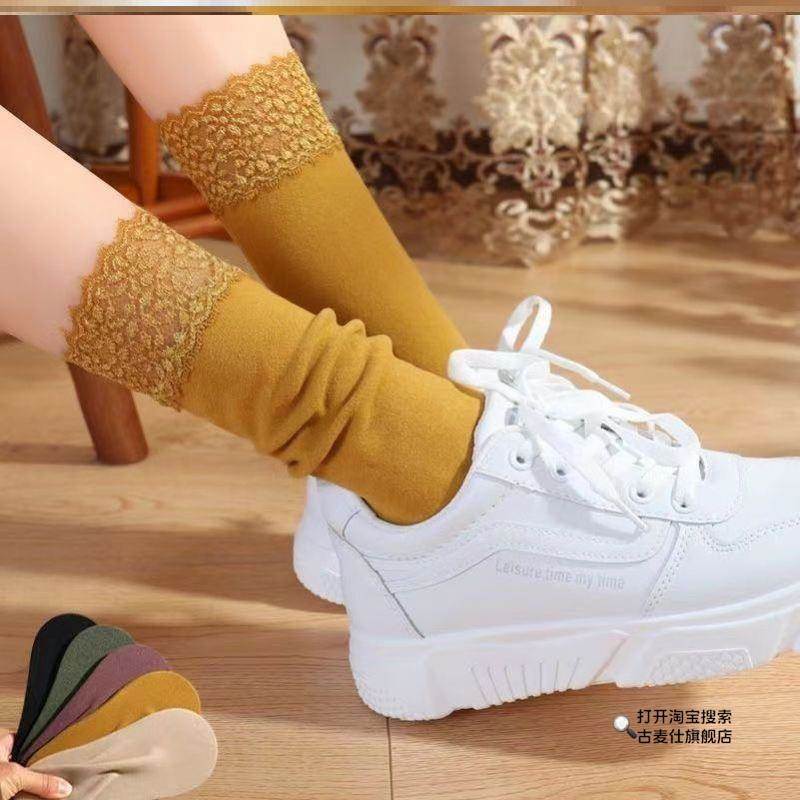 蕾丝长筒德绒袜子女士加厚保暖韩国中筒日系堆堆袜ins潮秋冬季