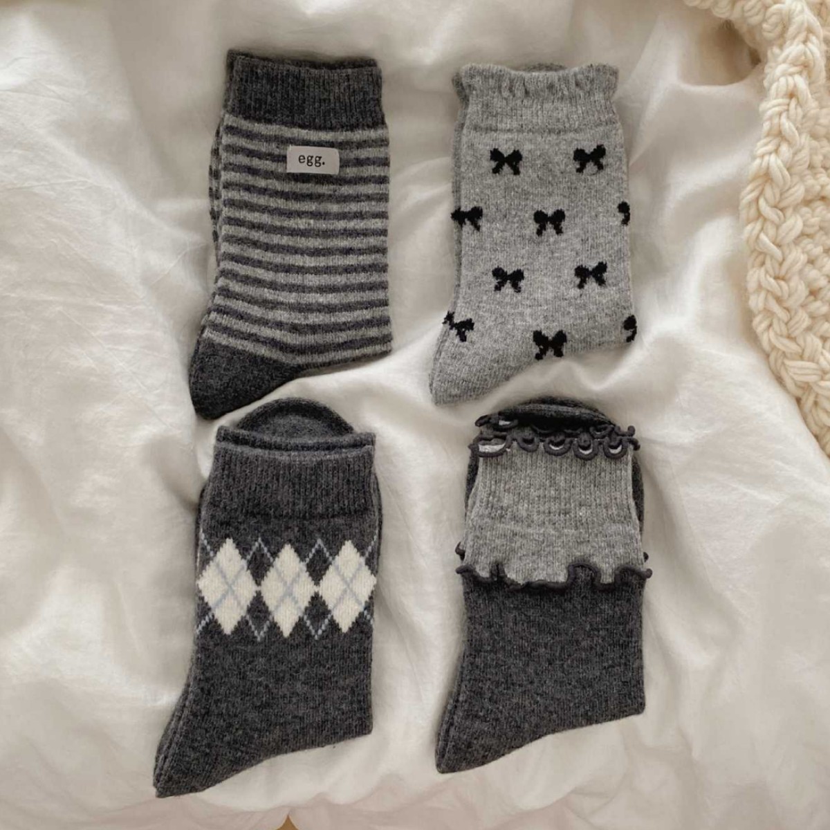 秋冬袜子女中筒绵羊毛堆堆袜韩版蝴蝶结菱格女士保暖厚袜子无骨袜