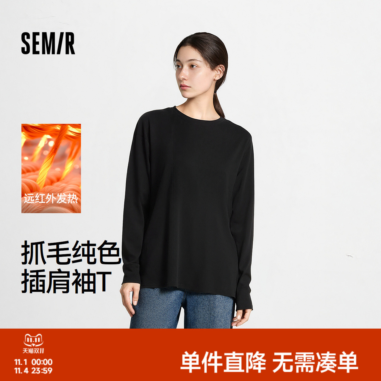 森马长袖T恤女中长款宽松发热纯色插肩袖2025冬新款抓毛开叉上衣