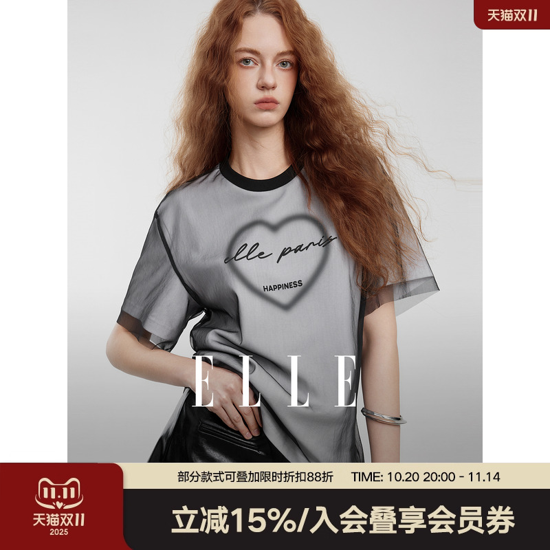 ELLE设计感字母印花宽松休闲T恤女2025夏季新款时髦小众纯棉短袖