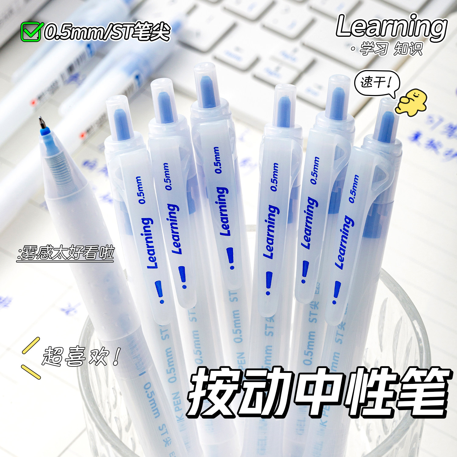爱好晶蓝色中性笔高颜值ins风ST笔尖中性笔速干顺滑学生专用0.5mm按动中性笔蓝色芯水性笔学生标记笔划重点