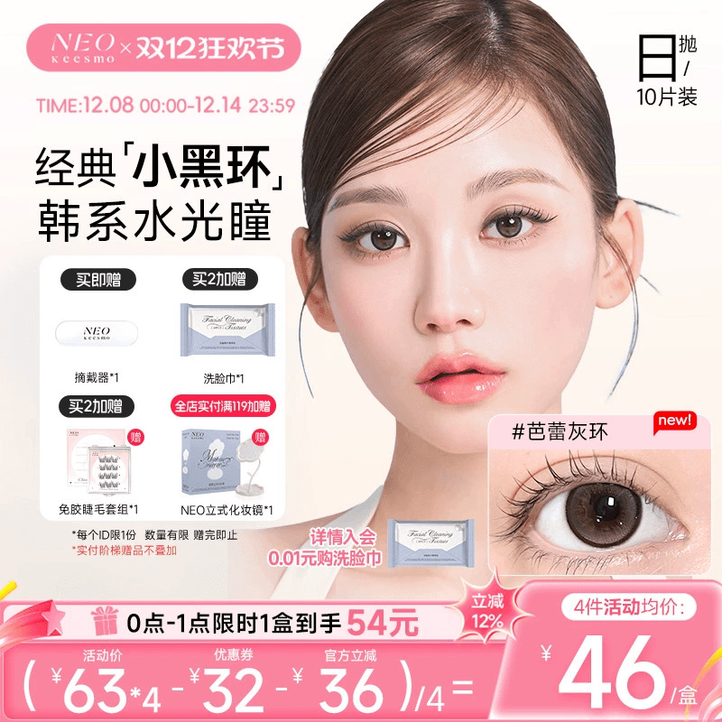 NEO经典小黑环日抛美瞳4片清透水光感小直径彩色隐形眼镜芭蕾灰环