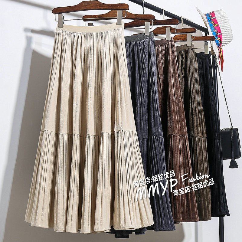 大码丝绒口袋百褶裙女中长款高腰a字裙秋冬韩版显瘦蓬蓬裙半身裙