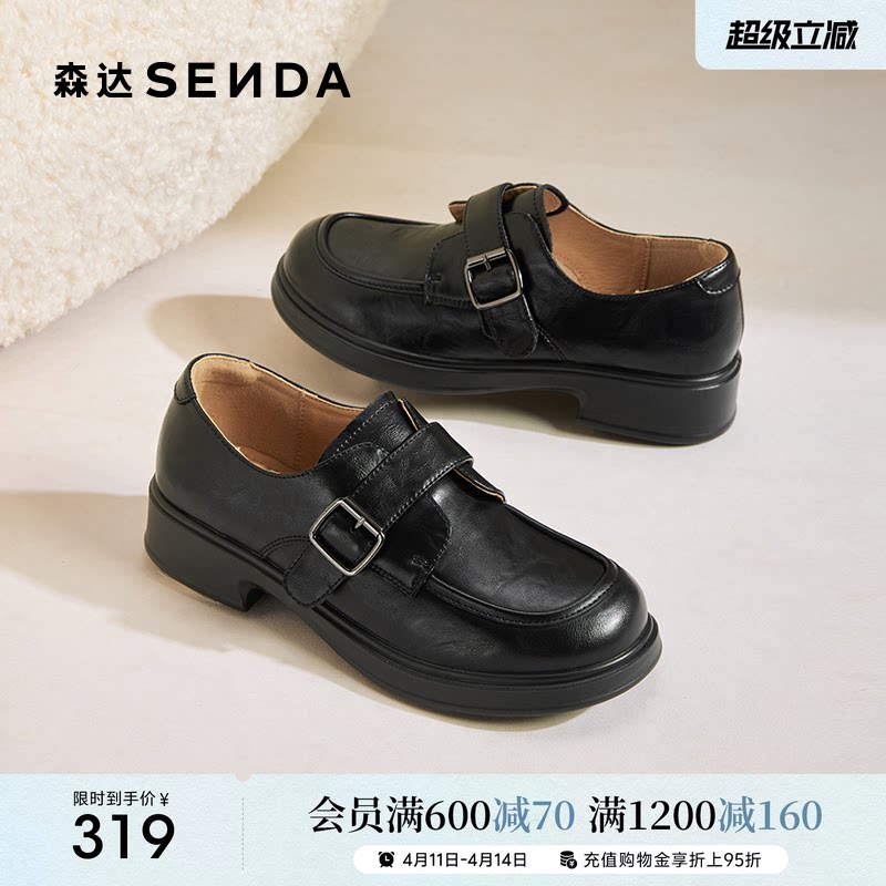 森达春新款厚底乐福鞋女鞋厚底商场同款软底真皮英伦黑色单鞋皮鞋