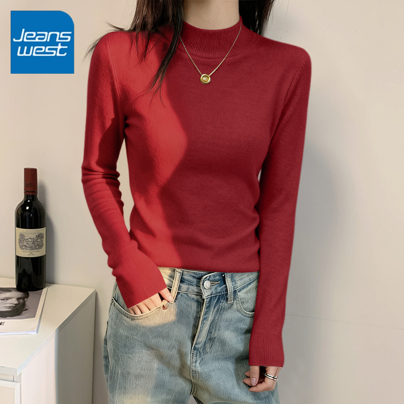 复古红色半高领修身打底衫女2025年新款内搭长袖上衣羊毛保暖t恤