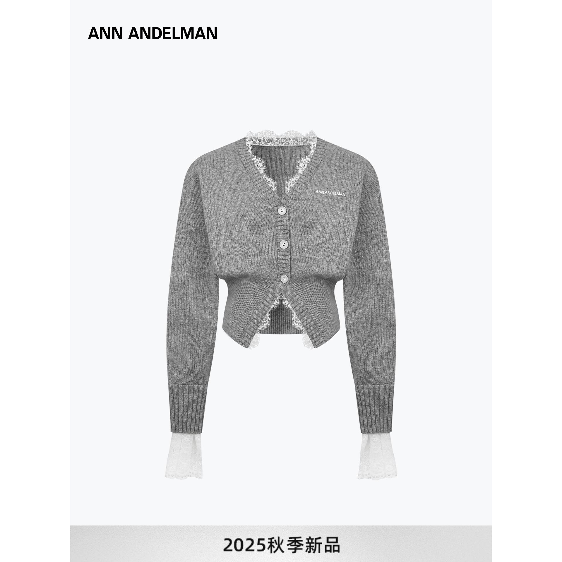 ANN ANDELMAN秋冬薄外套女V领设计蕾丝拼接收腰毛织开衫