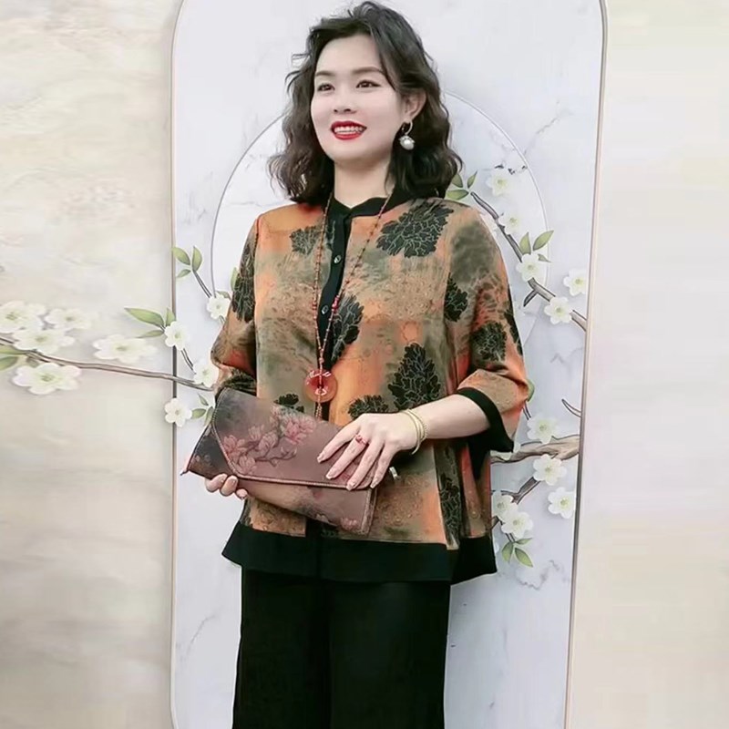 中老年妈妈开衫上衣民族风50-60岁真丝大码200斤夏季国风薄外套女
