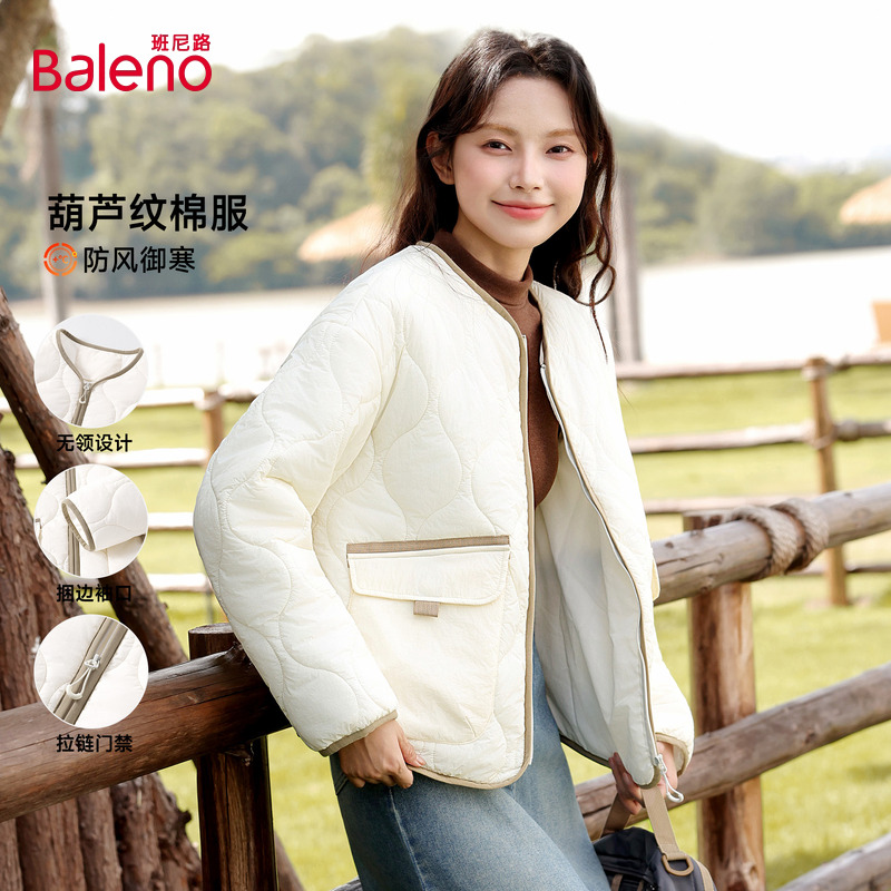 班尼路杏色超好看夹棉薄外套女棉服2025冬季新款小个子保暖棉袄H